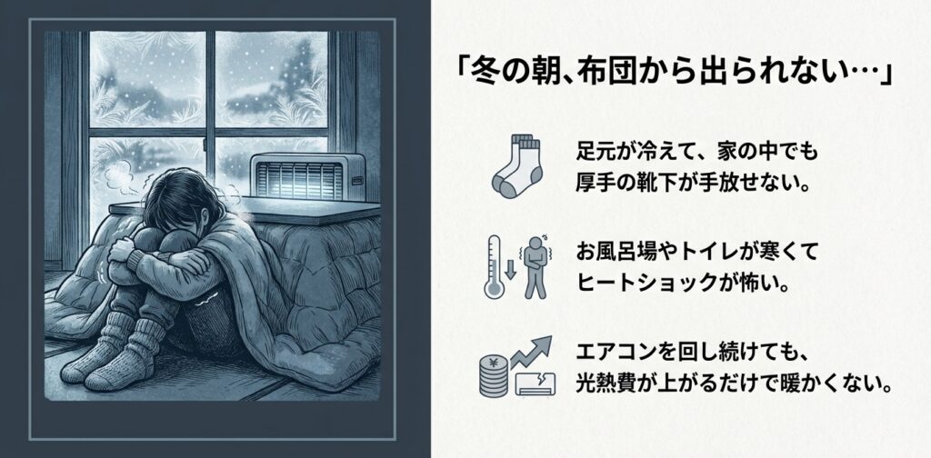 「冬の朝、布団から出るのが辛い…」 「リビングは暖かいのに、廊下やトイレに行くとゾクッとする」 「光熱費が上がっているのに、家がなかなか暖まらない」