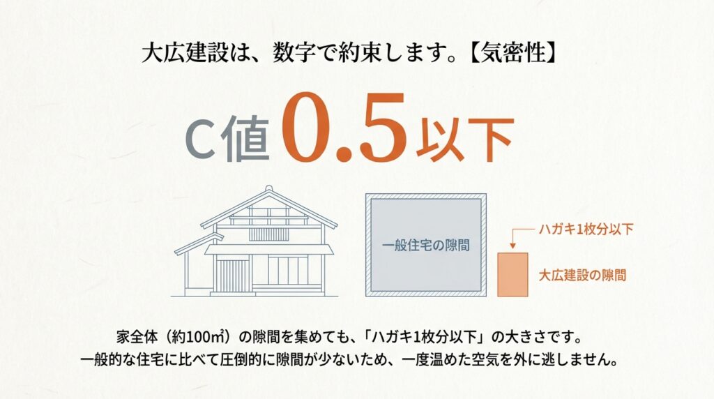 気密性能(C値):0.5以下 家全体にどれだけの隙間があるかを示す数値です。「0.5」とは、家全体の隙間をかき集めてもハガキ1枚分以下という極めて高い精度です。