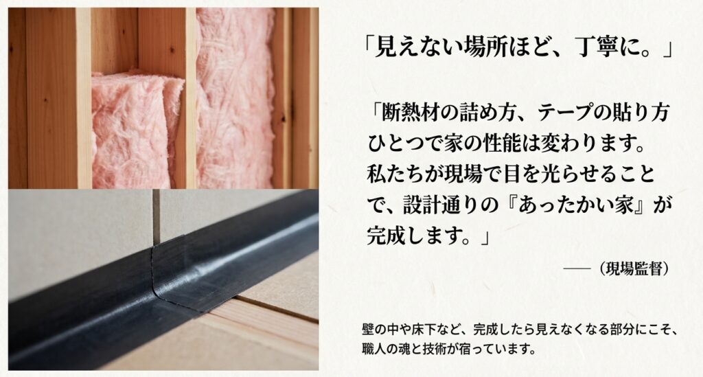 一般的な家づくりでは、営業・設計・施工が別々の会社や担当になることが多く、現場で「言った・言わない」のミスや、細かい断熱材の施工漏れが起きやすいのが現状です。