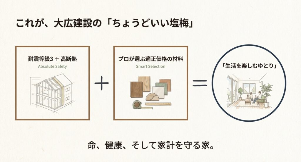 私たちは、ただ高価な材料を使えば良いとは考えていません。 あまりに高価な設備を詰め込みすぎて、住宅ローンの支払いに追われる生活は本末転倒だからです。