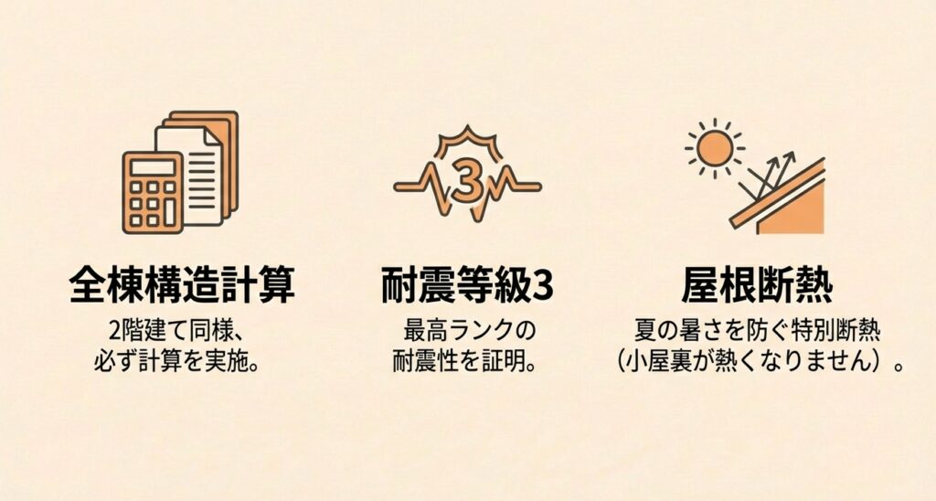 - 全棟構造計算:平屋であっても必ず構造計算を行い、耐震等級3(最高ランク)を証明します。