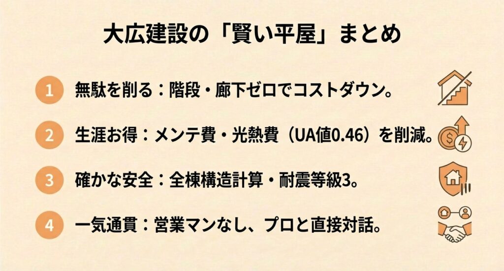- 屋根断熱のこだわり:平屋は屋根からの熱の影響を受けやすいという弱点があります。大広建設の断熱技術(UA値0.46)なら、夏でも小屋裏が熱くならず、1年中サラッとした空気の中で過ごせます。