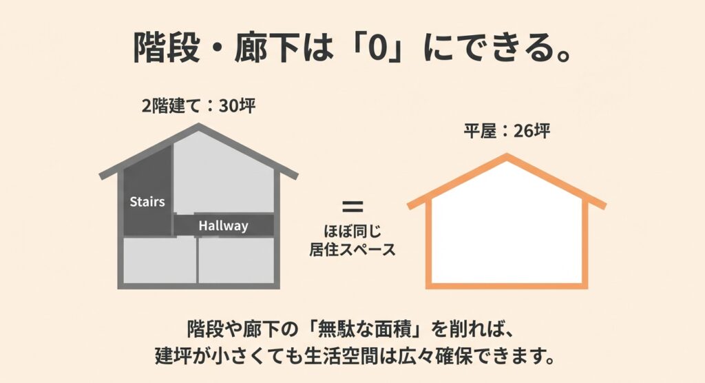 - 無駄な面積を削れる:階段や、階段に付随する廊下が必要ありません。2階建ての30坪と、平屋の26坪は、ほぼ同じ広さの居住スペースを確保できます。