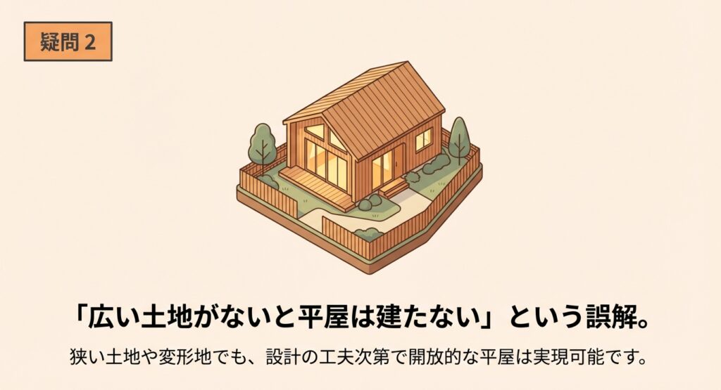 「広い土地がないと平屋は建たない」というのも、設計次第で解決できます。
