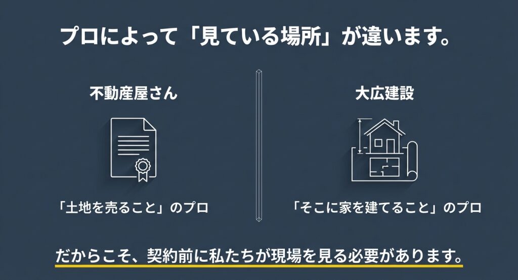 不動産屋さんは「土地を売ること」のプロですが、私たちは「そこに家を建てること」のプロです。