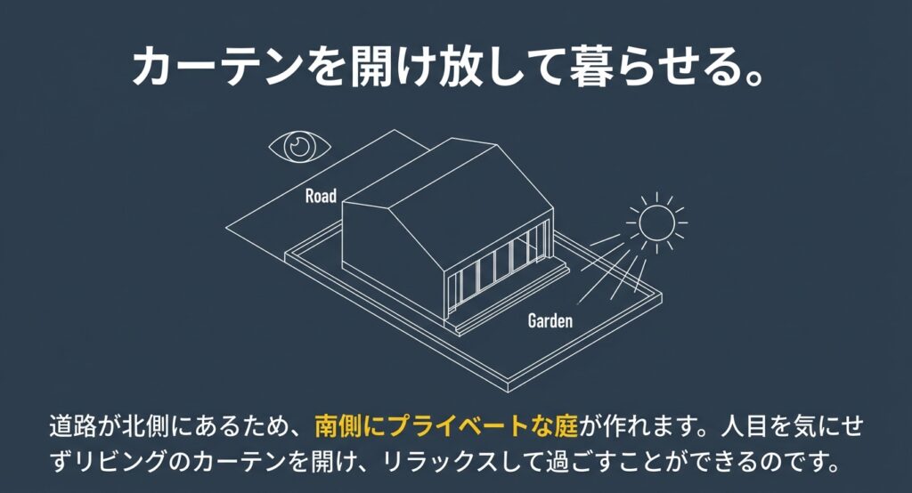 - 南側にプライベートな庭が作れる:道路が北側にあるため、人目を気にせずリビングのカーテンを開け放して過ごせます。