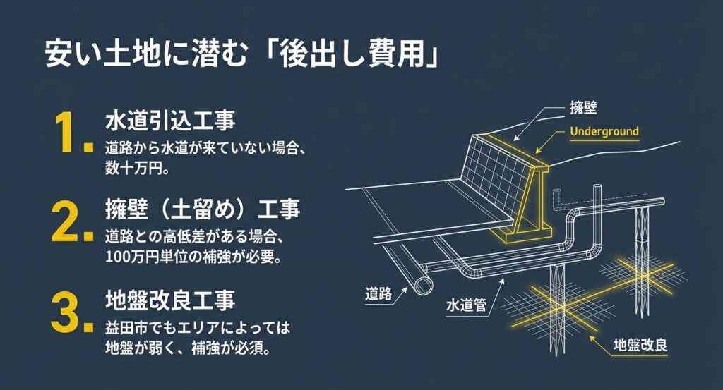 - 高低差による土留め(擁壁)工事:土地が道路より高い、あるいは低い場合、補強に100万円単位の費用がかかることがあります。