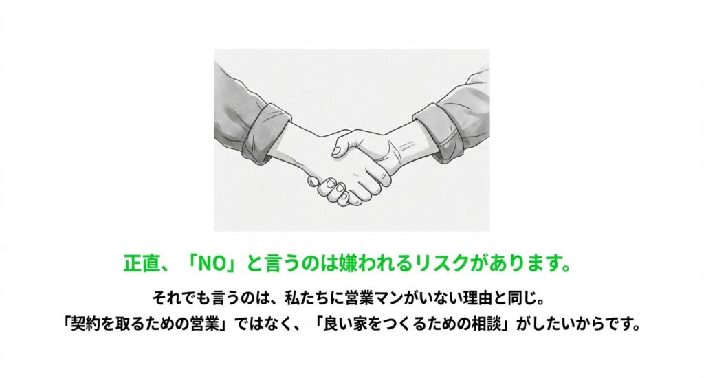 「契約を取るための営業」ではなく、「良い家をつくるための相談」をしたいから。