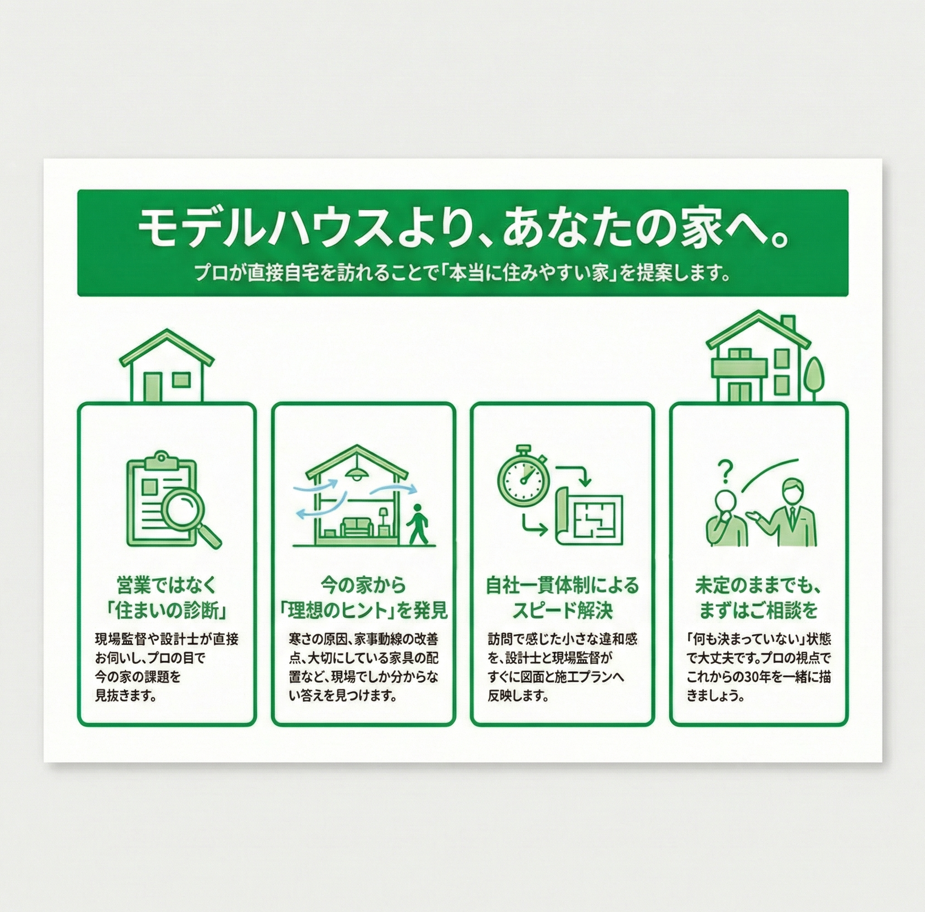 モデルハウスはありません。その代わり、あなたの家へ「現場監督」がお伺いします。