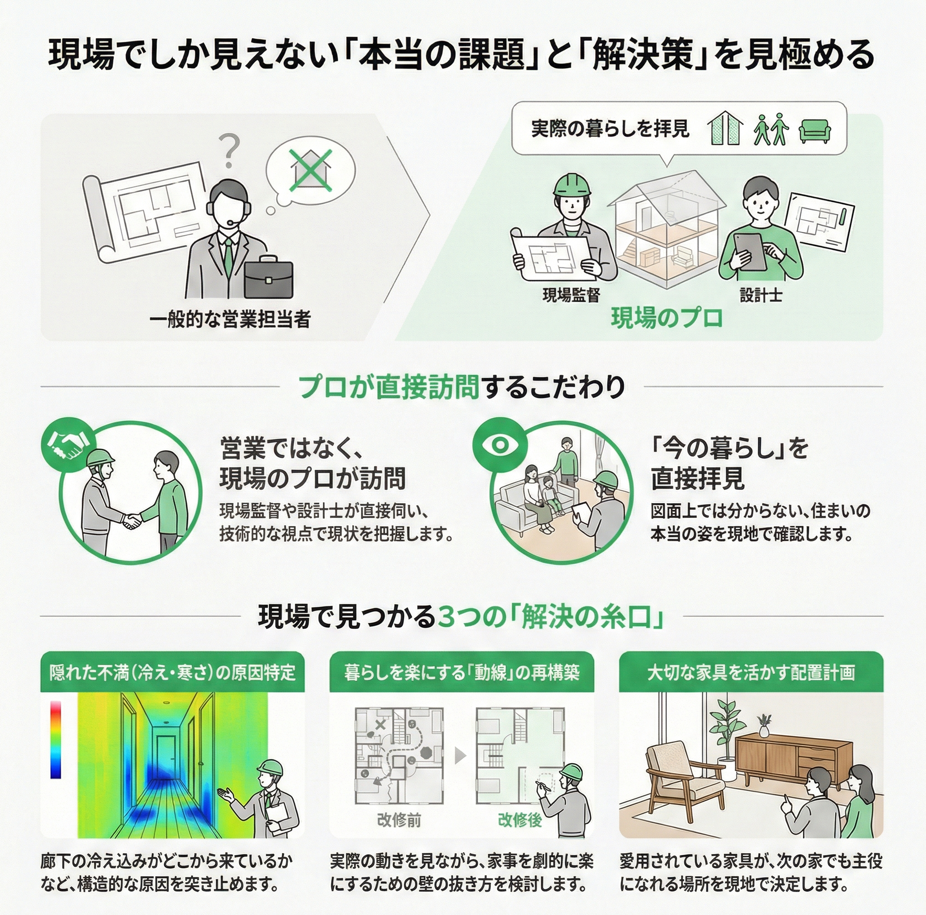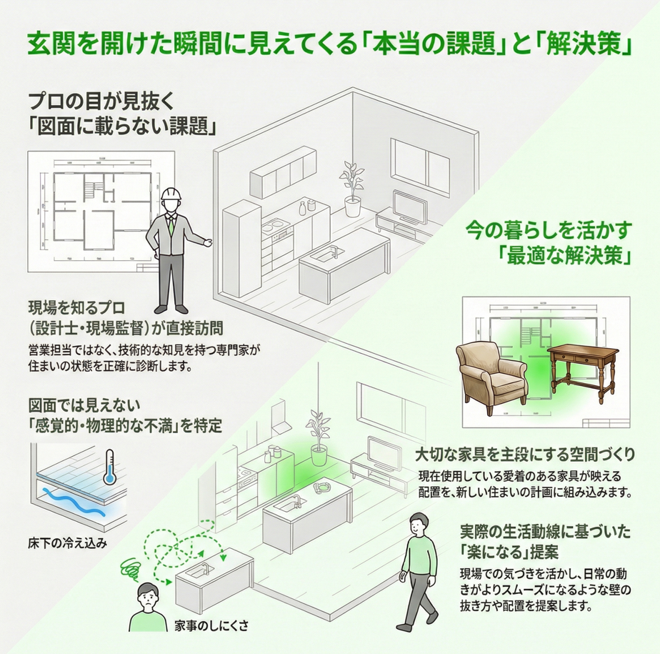 実際に今の暮らしを拝見することで、図面の上だけでは決して見えてこない「本当の課題」と「解決策」が、プロの目には見えてきます。