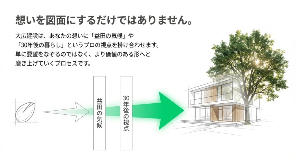 大広建設では、その「想い」をただ図面にするだけではなく、益田の気候や30年後の暮らしを見据えたプロの視点を掛け合わせ、より価値のある形へと磨き上げていきます。