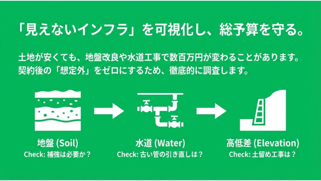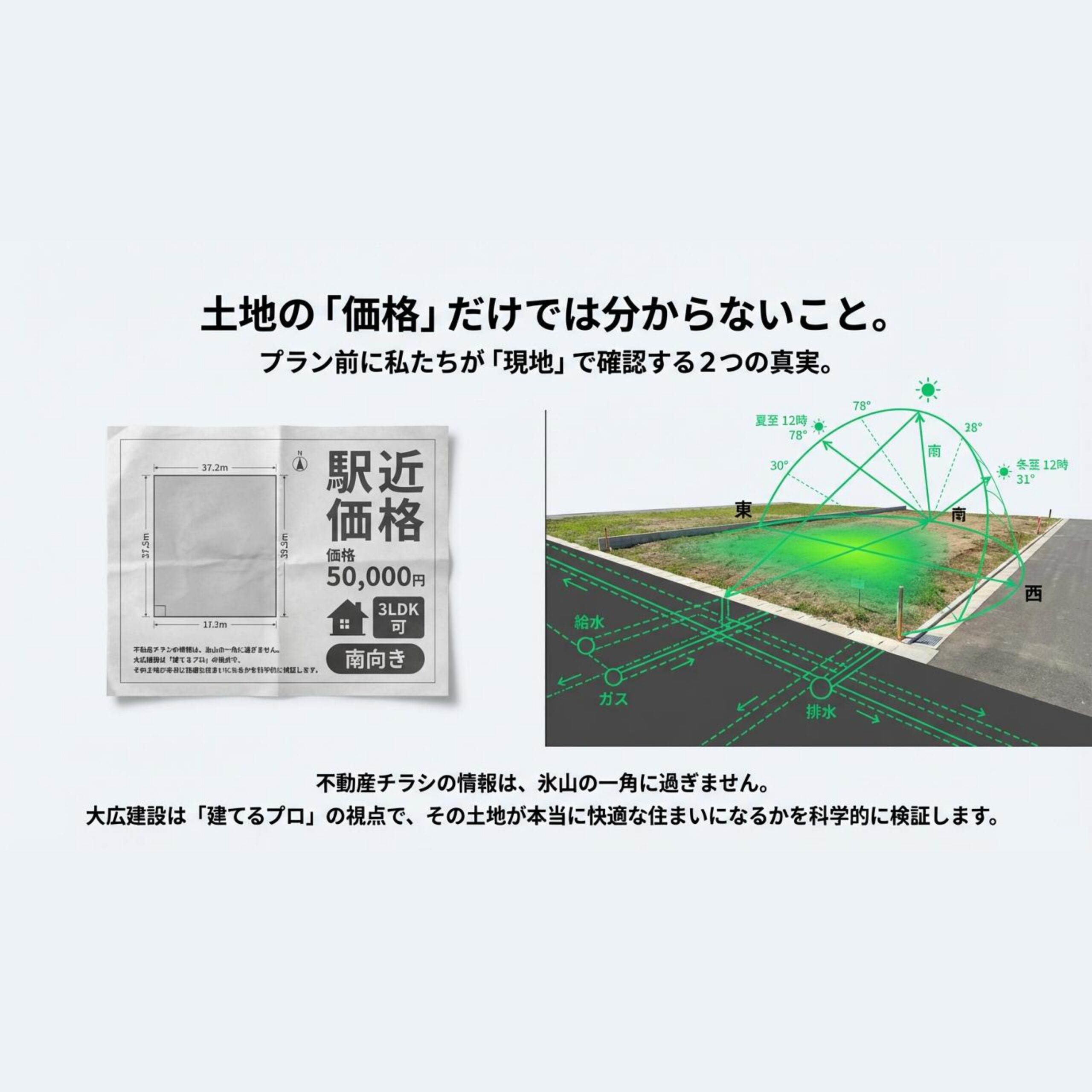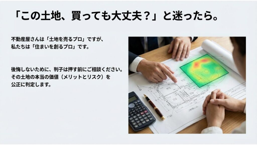 不動産屋さんとは違う「建てるプロ」の視点で、その土地の本当の価値を判定し、後悔しない家づくりをお手伝いします。