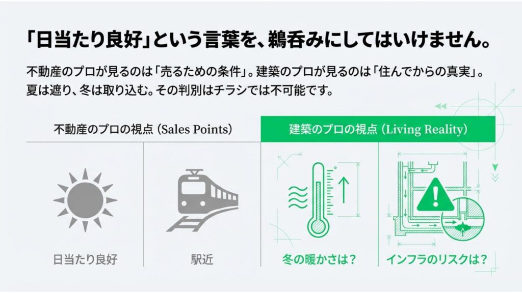 不動産情報のチラシに書かれた「日当たり良好」「駅近」といった言葉は魅力的ですが、私たち建築のプロが現地に立つとき、実は全く別の視点でその土地の「真実」を確認しています。