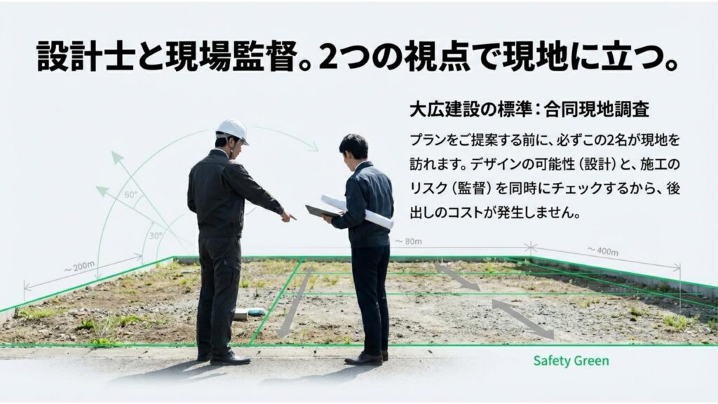 大広建設では、プランをご提案する前に、必ず現場監督と設計士が現地調査を行います。