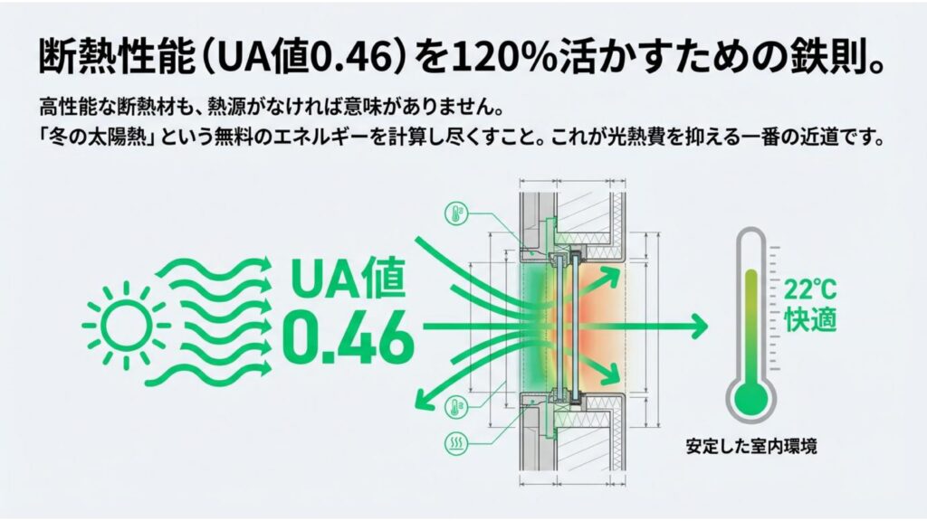 これが、私たちが掲げる「UA値0.46」という断熱性能を120%活かすための鉄則です。