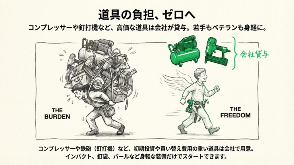 コンプレッサーや釘打機(鉄砲)など、初期投資や維持費がかさむ高価な道具は、すべて会社が貸与します。
