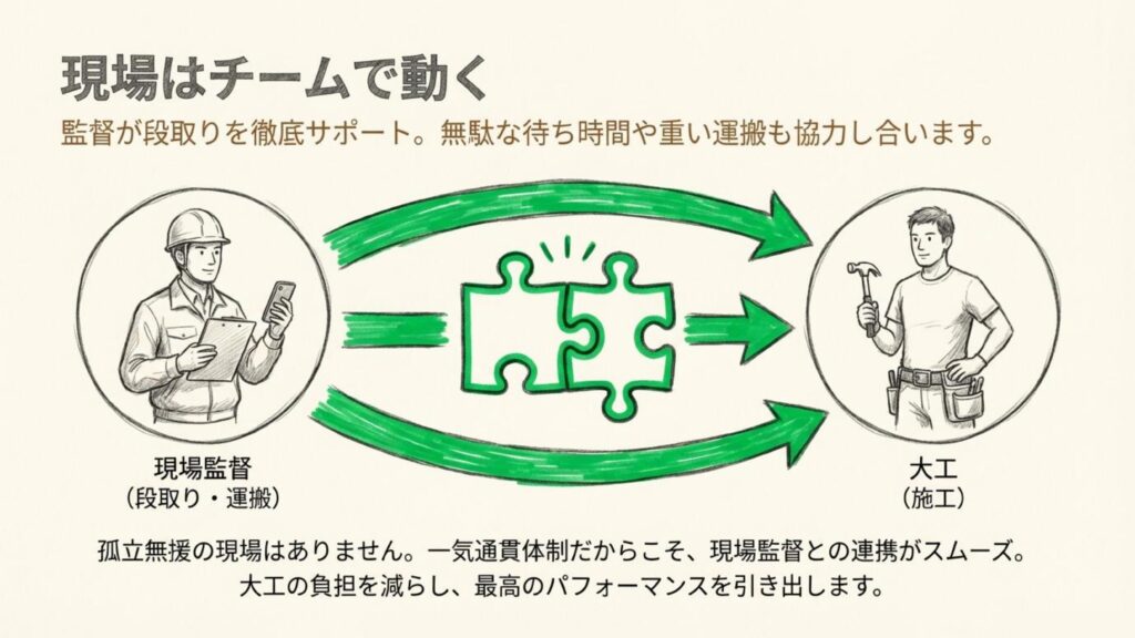 現場監督が段取りを徹底サポートし、無駄な待ち時間や重い運搬も協力し合います。
