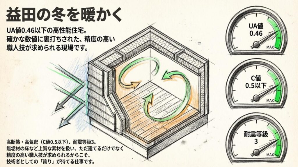 「UA値0.46以下」「C値0.5以下」という高い精度が求められる現場だからこそ、